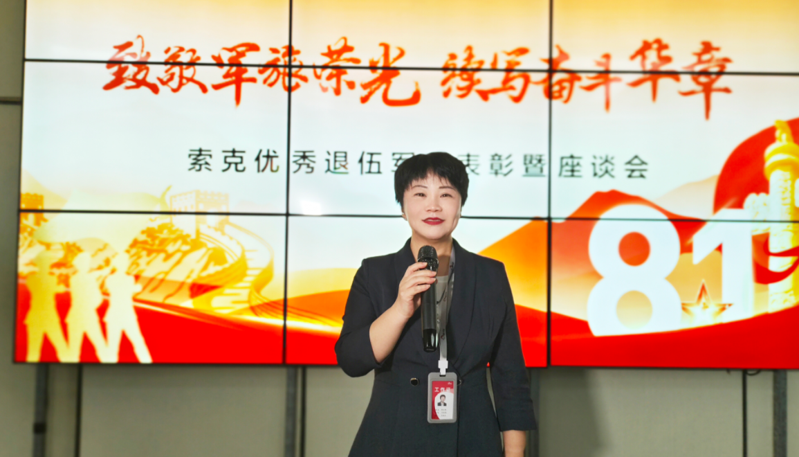 表彰座谈会上,公司总经理郝红梅发表了热情洋溢的致辞,向15位优秀退役军人表示最热烈的祝贺,高度赞扬他们将军人优良作风转化为企业奋斗动力的精神。人资法务部总监蒋丹孺现场宣读了表彰通报。随后,在庄重而热烈的气氛中,总经理郝红梅、公司董事卢建新共同为受表彰人员颁发了荣誉证书及奖品。